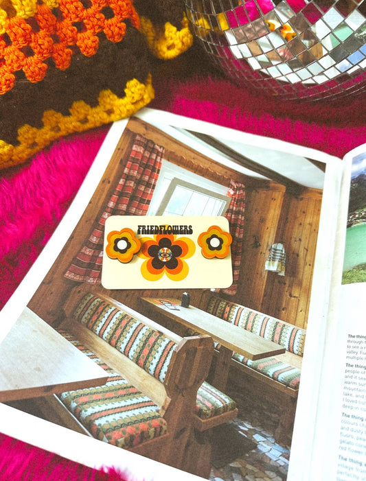boucle d'oreilles rétro Groovy des années 70 La GuimbardeBoucles d'oreilles groovy en forme de fleur marron d'inspiration rétro des années 1970