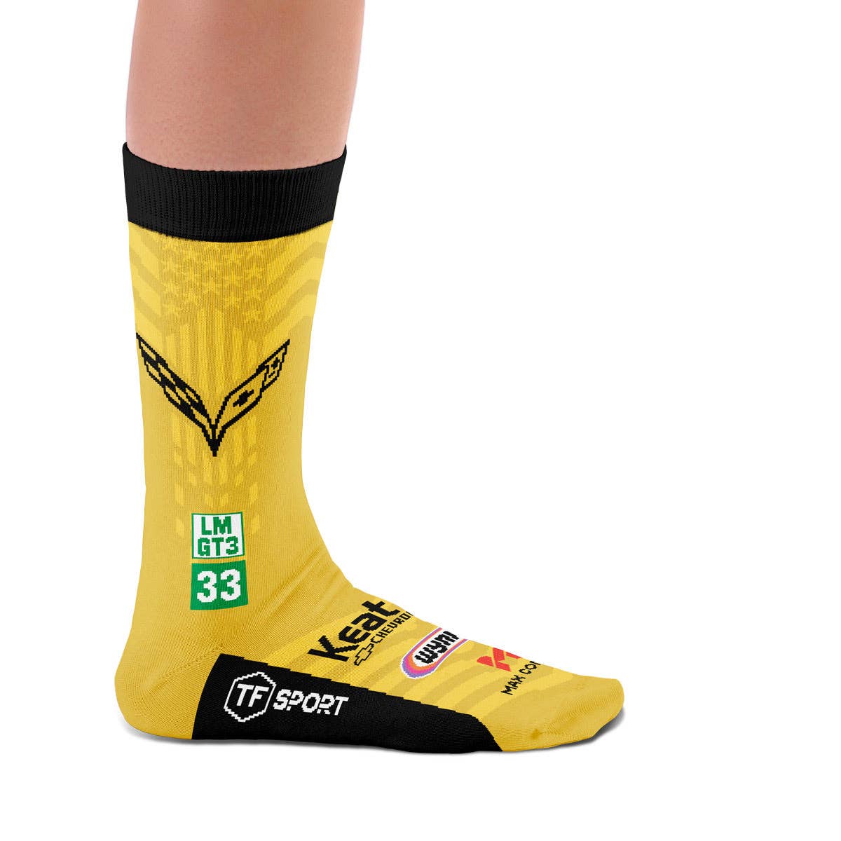 Un hommage à Ben Keating, Dani Juncadella et Jonny Edgar TF Sport Corvette Z06 GT3.R, cette chaussette allie muscle américain et endurance. Attendez-vous à des contrastes marqués, des lignes GT et une touche d'énergie jaune—conçue pour les fans qui vont au bout.