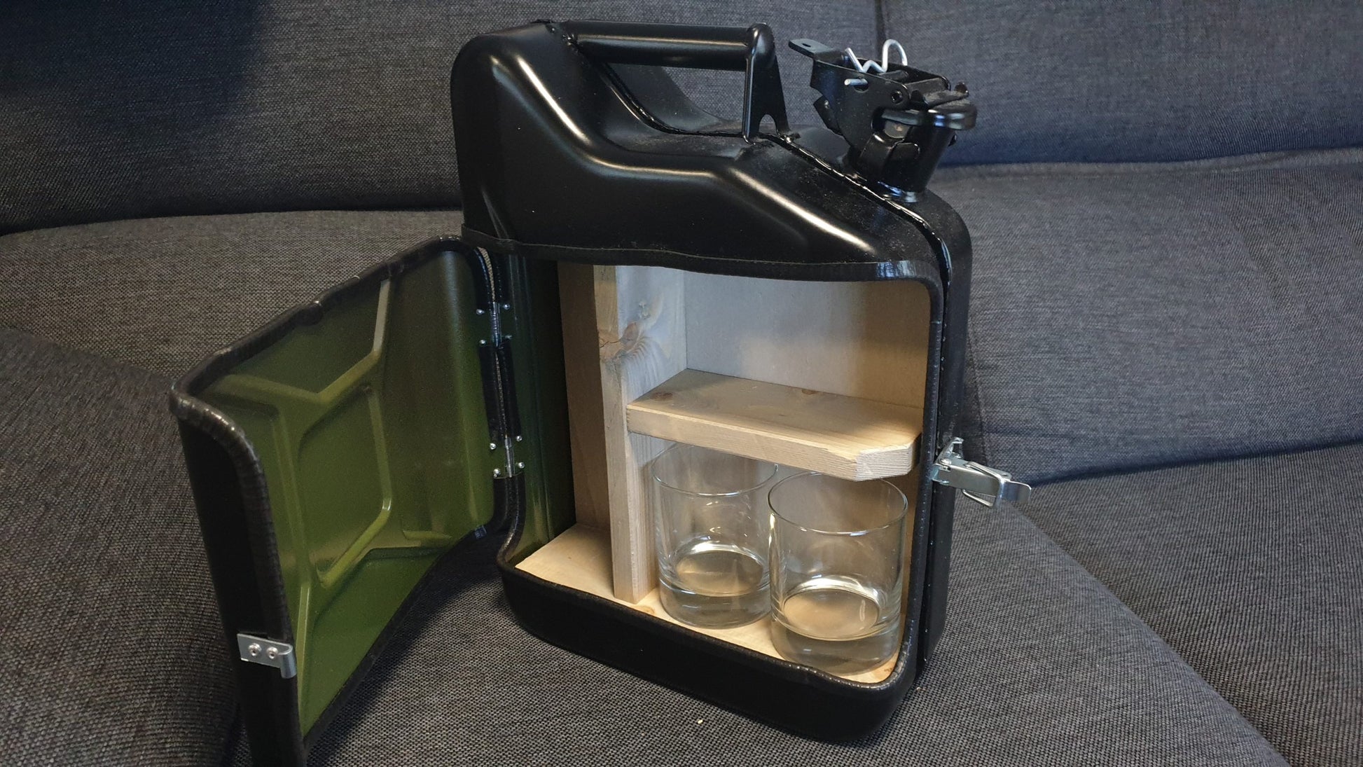 Le cadeau le plus cool à offrir ! Ce jerrycan de 10L est livré avec 2 verres à whisky il a une partie pour intégrer une bouteille et une autre pour des canettes de boissons.