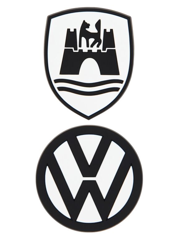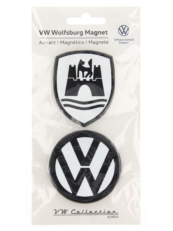 Lot de 2 aimants robustes en caoutchouc représentant le logo de la société VW et l'emblème de la ville de Wolfsburg, où se trouve le siège de Volkswagen. Ces aimants noirs et blancs, uniques en leur genre, attireront tous les regards sur le réfrigérateur de la cuisine, sur les tableaux de notes ou sur toute autre surface magnétique. Le cadeau idéal pour les fans de VW !